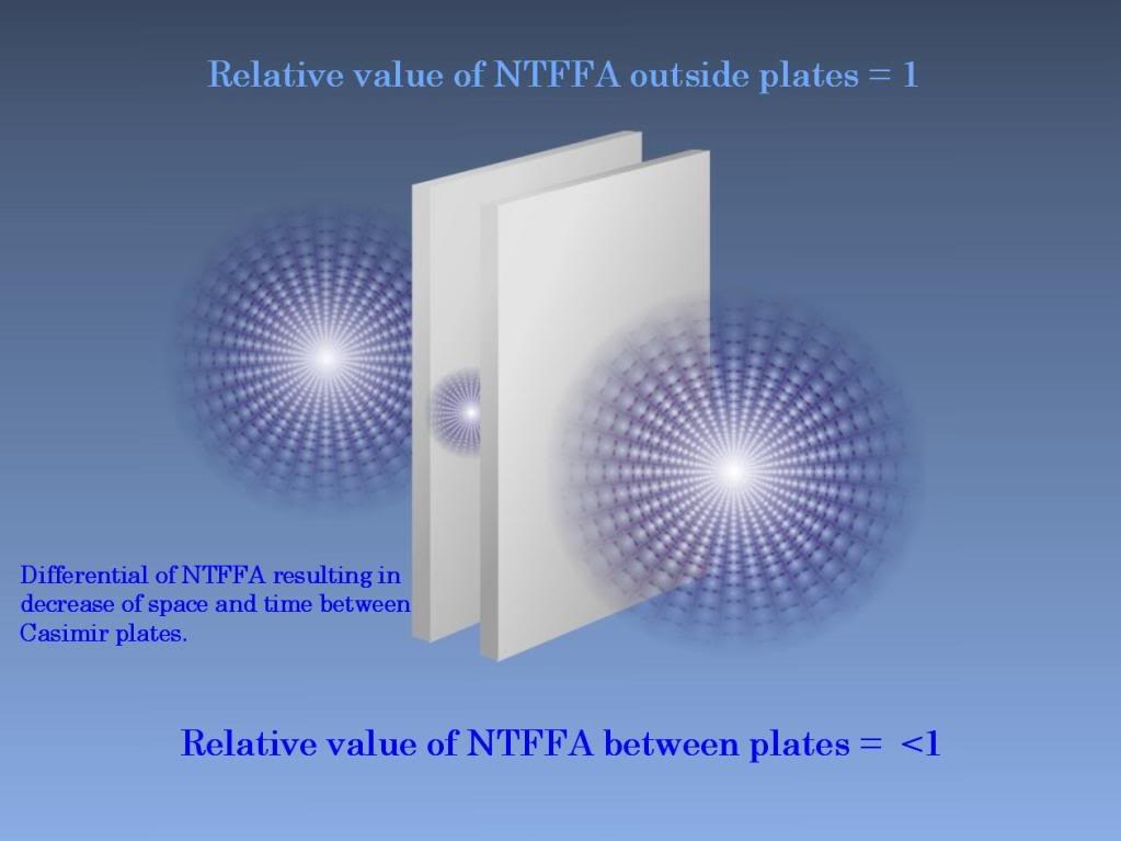 Two conductive or dielectric plates reaching a distance below 200 micrometers now are verging on a threshold limit where the directional properties of NTFFA are beginning to reduce their ability to express themselves geometrically into the three dimensional space, by nearing in on the very frequency range of NTFFA, and thereby creating a differential relative the NTFFA outside the plates. The differential created between the plates is similar to the differential created between two magnets of opposite poles, thus decreasing both space and time, and therefore creating the attractive response.