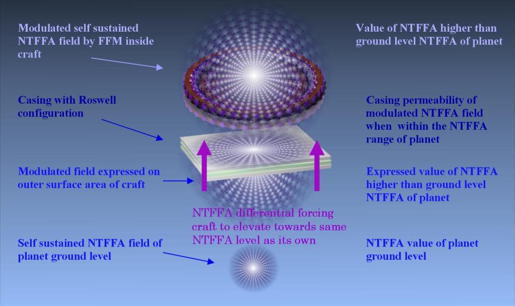 Our research into the workings of the extraterrestrial crafts was inspired by the possibility of modulating this underlying field derived from David Barclay’s theory, by diffracting the field into a frequency focus of higher NTFFA than the NTFFA of the surrounding field, which will lead to a decrease in gravity.