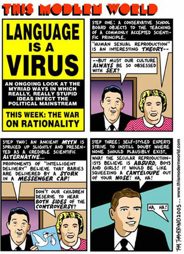 | Thomas Lindström wrote: | | Tom Tomorrow förblir en av de mer klarsynta betraktarna och intelligenta kommentatorerna av det amerikanska samhället under George W Bush. Gång på gång återvänder han till en av de mer häpnadsväckande aspekterna av den radikala högerns revolution: Förlusten av rationellt tänkande. Det rationella (förnuftet) är så dött som något kan bli. Sanning är fullkomligt irrelevant. Allt - med betoning på ALLT - som stöder ditt synsätt är OK. Hur skulle det kunna vara annorlunda när Mannen i Huset har satt nivån på kommunikationen så lågt det går och sedan spikat fast den där? |